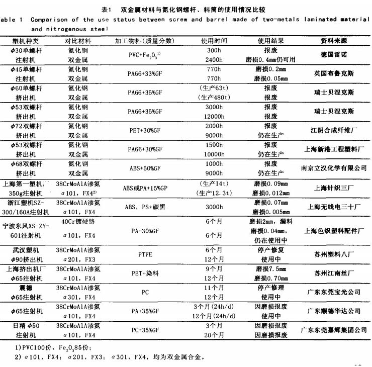 采用雙合金螺桿及雙合金料筒組裝的擠出機和注射機,由于螺桿與料筒的耐磨性及耐腐蝕性好,其使用壽命比采用氮化鋼螺桿與料筒時的使用壽命要高得多。在表1中列舉了一些國 內外有關單 提供的數據,供讀螺桿的客戶參考。
